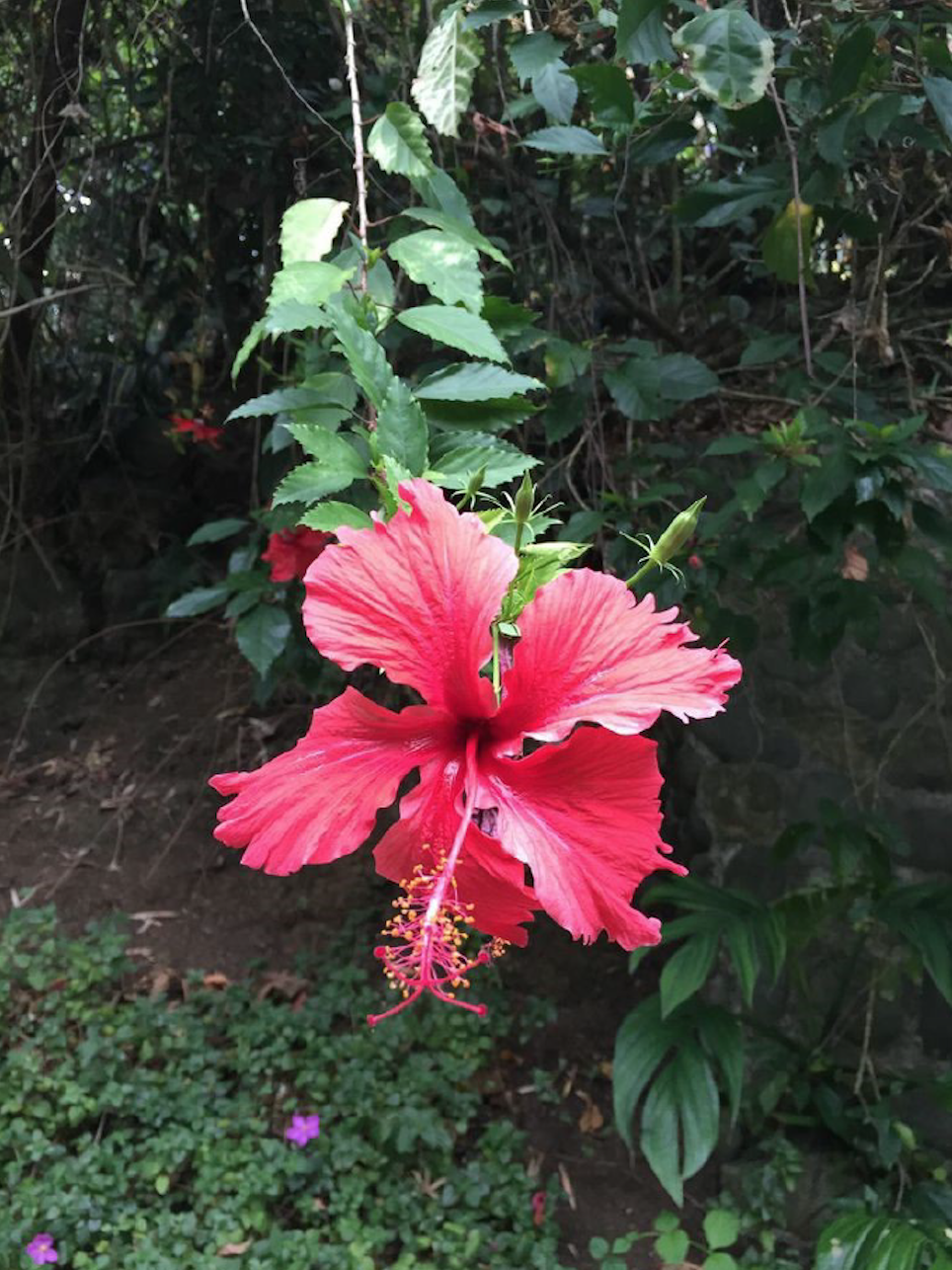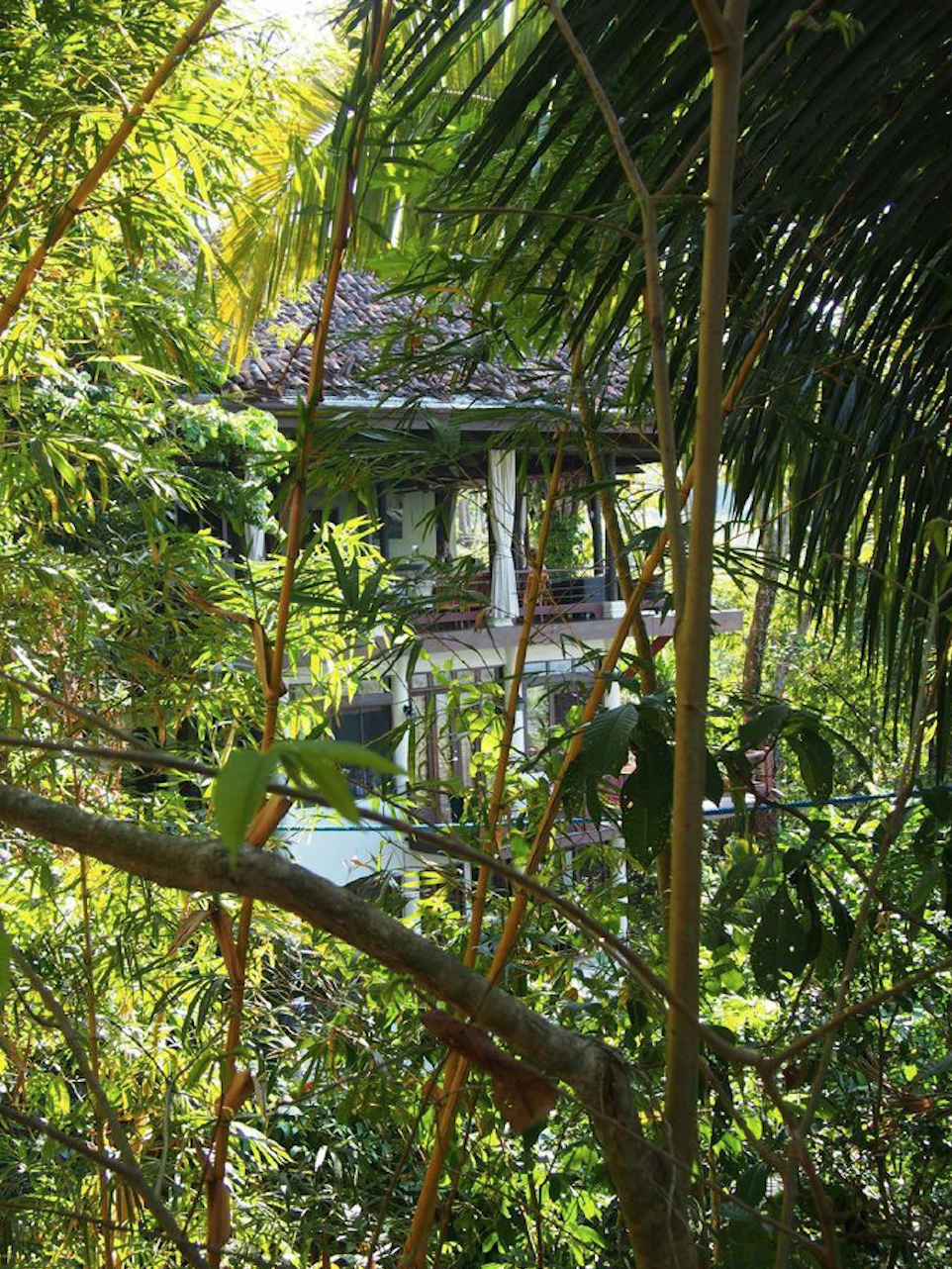 Nhìn xuống vườn hoa, chiếc cổng tối qua không dịp nhìn rõ hai bên trồng đầy kỳ hoa dị thảo, hoa lan đủ màu đủ loại chi chít bên nhau, màu sắc cứ như là những cô tiên trên thượng giới. Trên trần một chiếc mái cong cong che nắng, phủ xuống những bông hoa giấy đủ màu nào tím xanh, hồng cam đỏ, kèm xung quanh những thân dừa con con che nắng, bụi chuối cao có chừng 10 mét xòe những chiếc lá khổng lồ, chen thêm vào là những cây đu đủ trái bao chung quanh xanh mướt rồi nào là xoài trĩu nặng trái trên cây.