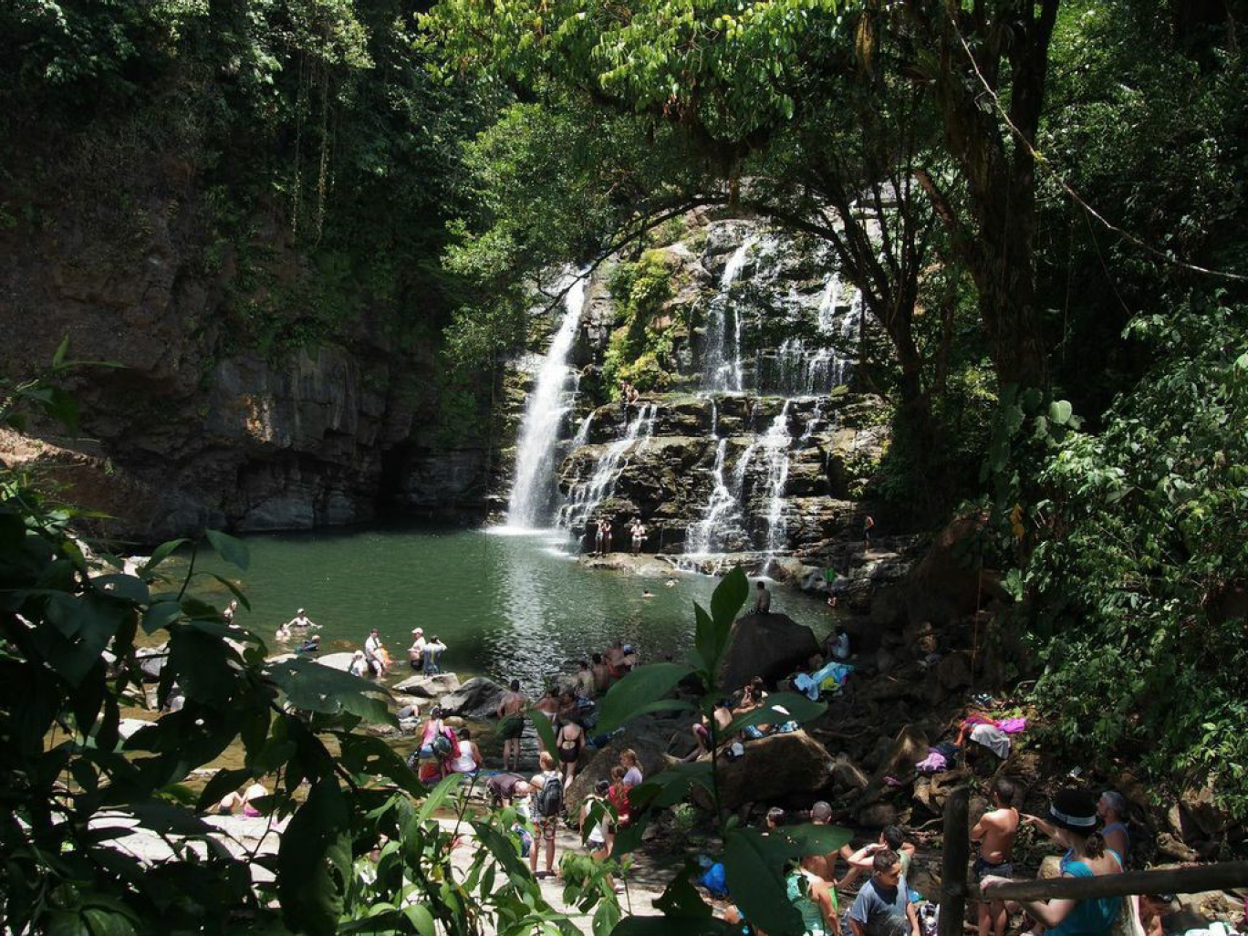 Chúng tôi lại lên xe, bà con đang trầm trồ thác nước Nauyaca.