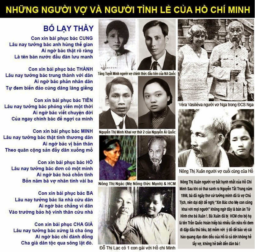 -Năm 1954, b/h về Hà Nội , theo Vũ Thư Hiên và Nguyễn Minh Cần, đảng cs đã đưa cô gái thuộc sắc tộc Nùng ở Cao Bằng là NÔNG THỊ XUÂN, có sách viết NGUYỄN Thị Xuân, về phục vụ hcm 1955. Lúc đó b/h khoảng 65 tuổi, bà Xuân khoảng trên dưới 22 tuổi, khá xinh đẹp.“Cô Xuân rất xinh gái, da trắng nõn, miệng tươi như hoa”. Năm sau bà Xuân sinh một con trai, đặt tên Nguyễn Tất Trung. Hcm đã “sa thải” bà Xuân (vì bà muốn được b/h công khai thừa nhận là vợ!), và bị tên bộ trưởng côn.. đồ Trần quốc Hoàn hiếp dâm rồi thủ tiêu bà một cách tàn bạo...